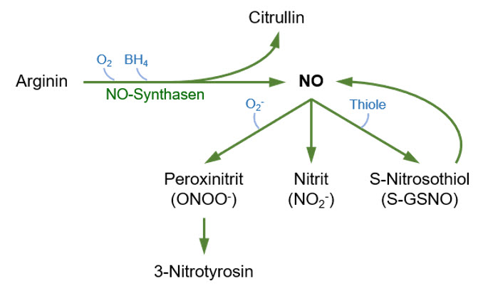 Umwandlung von Arginin und O2 über NO-Synthasen in Stickstoffmonoxid (NO) und Citrullin. Weitere Metabolisierung in u.a. Peroxinitrit und 3-Nitrotyrosin. (Quelle: eigene Abbildung)