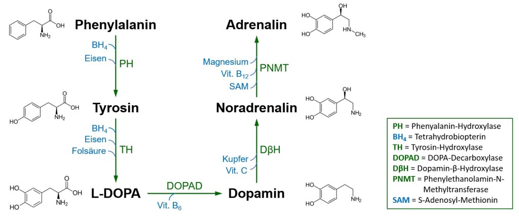 Katecholaminmetabolismus mit relevanten Cofaktoren. (Quelle: eigene Abbildung)